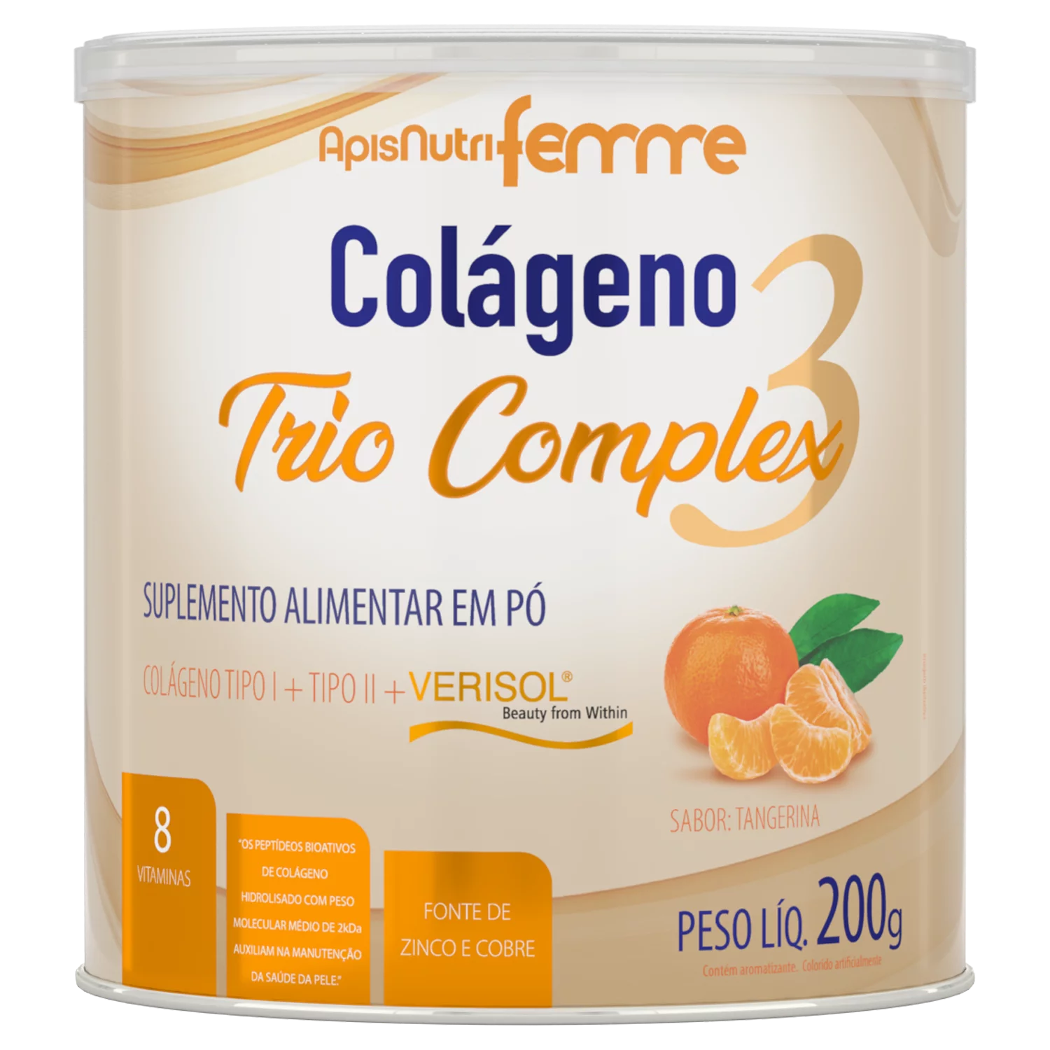 Também possui o Colágeno Verisol®, que é composto por Peptídeos Bioativos de Colágeno® especialmente desenvolvidos para a manutenção da beleza da pele, retardando os sinais do envelhecimento, suavizando a formação de rugas e contribuindo para um aumento da elasticidade e da firmeza deste importante órgão. Agite o frasco e adicione 10g (2 scoops) em 200ml (1 copo) de água fria, mexa até diluir completamente. Ingerir imediatamente após o preparo. Recomendação de uso: 19 (dezenove) anos ou acima. Ingredientes Colágeno hidrolisado, colágeno hidrolisado VERISOL®, colágeno tipo II. Vitamina C, bisglicinato de zinco, vitamina E, vitamina B5, bisglicinato de cobre, vitamina B2, vitamina B6, vitamina A, vitamina B9, vitamina B7. Acidulante: ácido cítrico. Aromatizante: aroma de tangerina idêntico ao natural. Corantes: vermelho bordeaux e amarelo crepúsculo. Edulcorante: sucralose. Antiumectante: fosfato tricálcico.