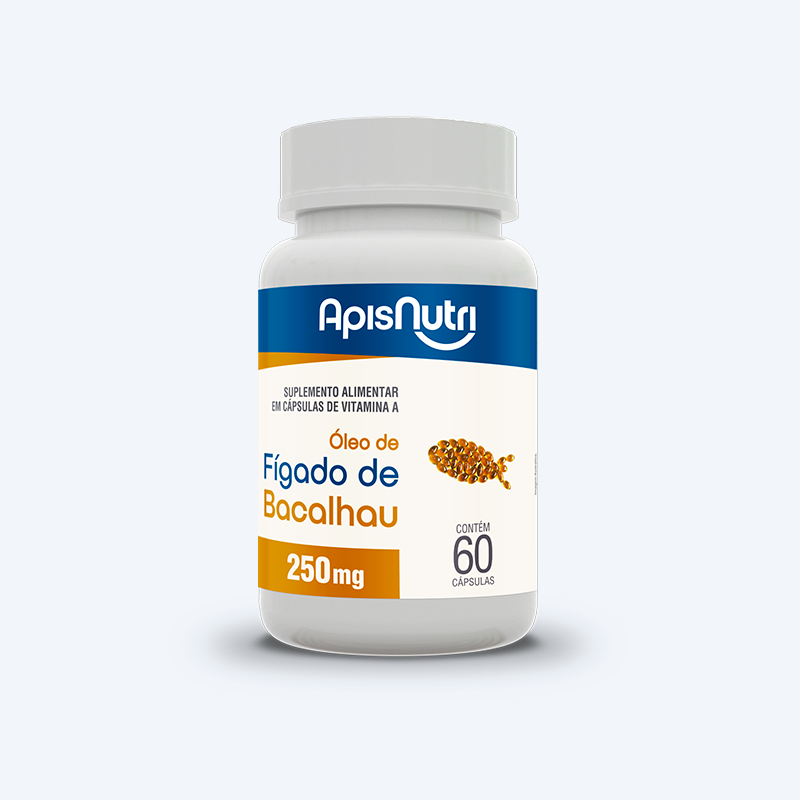 O suplemento alimentar de óleo de fígado de bacalhau em cápsulas contém ácidos graxos EPA e DHA (ácidos poliinsaturados), gorduras da família do ômega-3. Ele conta também com quantidades consideráveis de vitamina A e vitamina D. Fracos com: 60 Cápsulas 250 mg. Modo de uso: 1 Cápsula 2 vezes ao dia. Composição: óleo de fígado de bacalhau. Composição da cápsula: gelatina, glicerina (umectante) e água purificada. NÃO CONTÉM GLÚTEN. ALÉRGICOS: CONTÉM PEIXE.