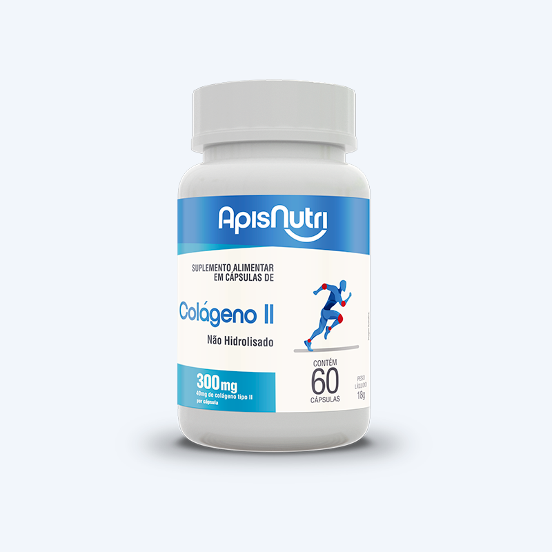 O colágeno tipo II é a forma não desnaturada do colágeno, normalmente extraída do frango. Este tipo de colágeno é ingerido numa dose menor que o colágeno hidrolisado. O colágeno tipo II da Apisnutri fornece 40mg de colágeno tipo II não desnaturado por porção. O colágeno tipo II não desnaturado auxilia na manutenção da função articular Frasco com: 60 Cápsulas 300 mg. Modo de uso: 1 Cápsula ao dia. Composição: Colágeno Tipo II. Agente de massa: Talco USP. NÃO CONTÉM GLÚTEN. Contém 40mg de Colágeno Tipo II por dose diária.