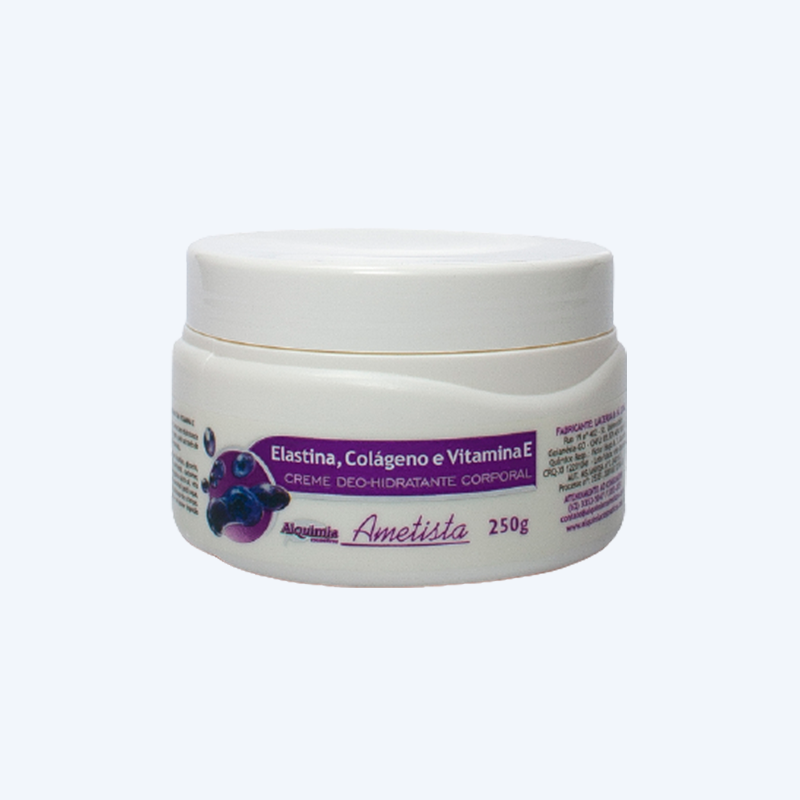 Creme Hidratante Corporal Ametista Alquimia Cosméticos A associação do Colágeno, Elastina e Vitamina E contida no Creme Deo-Hidratante Corporal da Linha Ametista, confere maior elasticidade e vigor a pele através do fortalecimento das fibras, deixando-a com uma aparência renovada. 250 g MODO DE USAR: Aplicar em todo o corpo após o banho até completa absorção. PRECAUÇÕES: Mantenha o produto fora do alcance de crianças. Caso ocorra o contato com os olhos, lave-os imediatamente e se houver ingestão acidental, procure um serviço de saúde mais próximo.