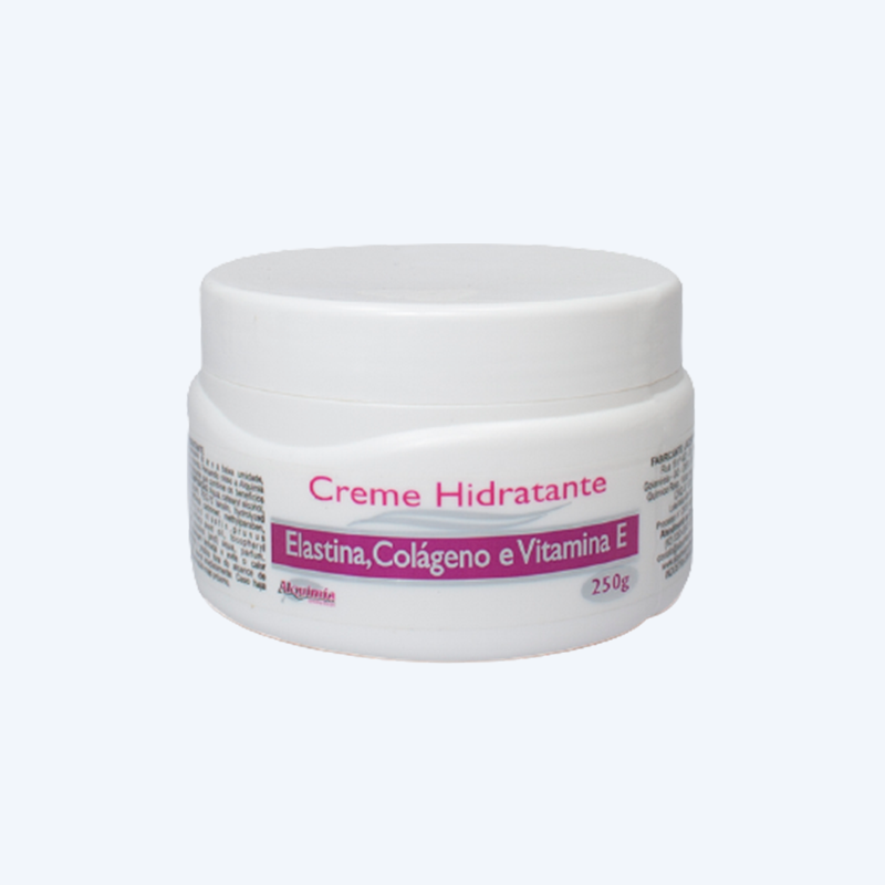 Creme Hidratante Elastina, Colágeno e Vitamina E Alquimia Cosméticos O contato diário com a poluição excessiva do ar e da baixa umidade, deixam a pele cada vez mais seca e cinzenta. Pensando nisso a Alquimia Cosméticos desenvolveu um creme hidratante que combine os benefícios do Colágeno, Elastina e Vitamina E. 250 g MODO DE USAR: Aplicar em todo o corpo após o banho, massageando suavemente até completa absorção. PRECAUÇÕES: Mantenha o produto fora do alcance de crianças. Caso ocorra contato com os olhos, lave-os imediatamente e se houver ingestão acidental, procure um serviço de saúde mais próximo.