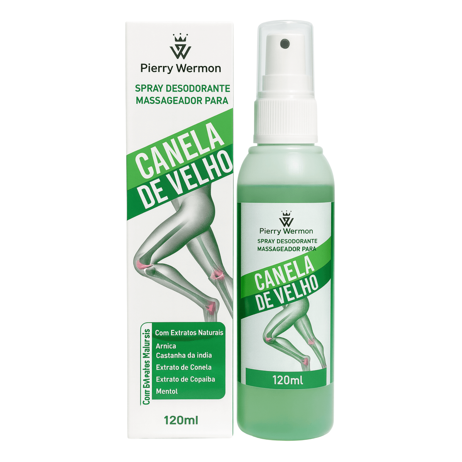 SPRAY DESODORANTE MASSAGEADOR PARA CANELA DE VELHO Conteúdo 120mL * SPRAY / DESODORANTE MASSAGEADOR PARA CANELA DE VELHO - Pierry Wermon foi cuidadosamente desenvolvido com insumos de alta performance para lhe proporcionar uma sensação de frescor, alívio, conforto e bem estar. SPRAY DESODORANTE MASSAGEADOR, PARA CANELA DE VELHO contém extratos naturais de Arnica (Arnica Montana Flower Extract), Castanha da Índia (Aesculus Hippocastanum Extract), Canela (Cinnamomum Zeylanicum Bark Extract ), Copaiba (Copaifera offinicinalis Extract), Mentol e Cânfora. Este produto é indicado para ser utilizado em massagens após atividades físicas como por exemplo caminhadas. Ameniza a sensação de cansaço corporal, proporciona alívio, frescor e suavidade para pernas e pés cansados após sua aplicação. Mero a a tampa e proteção da Va via, aperto), o proaso, derando a quantidade desejada produto sobre a pele e com a ponta dos dedos massageie de forma delicada a região, sem o uso das pontas das unhas. Massageie a região onde o produto foi aplicado até a completa absorção do mesmo. Não enxaguar. PRECAUÇÕES: USO EXTERNO. Não ingerir. Uso adulto, acima de 12 anos. Caso haja qualquer efeito indesejado, suspenda o uso. Não aplique sobre a pele lesionada ou irritada. Mantenha fora do alcance das crianças e animais domésticos. Evite contato com os olhos e mucosa, caso isso aconteça, lave-os com água corrente em abundância. O produto não deve ser ingerido. Em caso de ingestão, não provocar vômito e consultar imediatamente o serviço de saúde ou o centro de intoxicações mais próximo. Em caso de sinais de intoxicação ou irritação, suspender o uso e procurar orientação médica. O produto não deve ser aplicado por pessoas hipersensíveis a qualquer componente da fórmula. Manter em lugar fresco e seco, ao abrigo da luz direta do sol e em temperatura ambiente. O produto não deve ser usado por mulheres grávidas e lactantes.